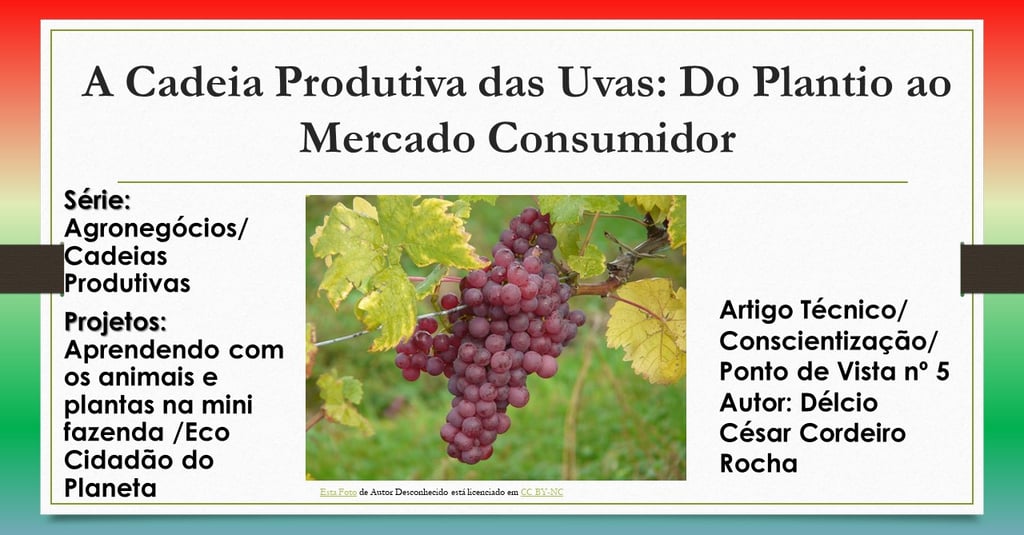Portal AGROECOBRASIL. ROCHA, Délcio César Cordeiro. A Cadeia Produtiva das Uvas: Do Plantio ao Mercado Consumidor. Série: Agronegócios/ Cadeias Produtivas. Artigo técnico/ Conscientização/ Ponto de Vista nº5. Publicado em 2024. Disponível em: https://agroecobrasil.com/a-cadeia-produtiva-das-uvas-do-plantio-ao-mercado-consumidor. Acesso em DIA/ MÊS/ ANO
