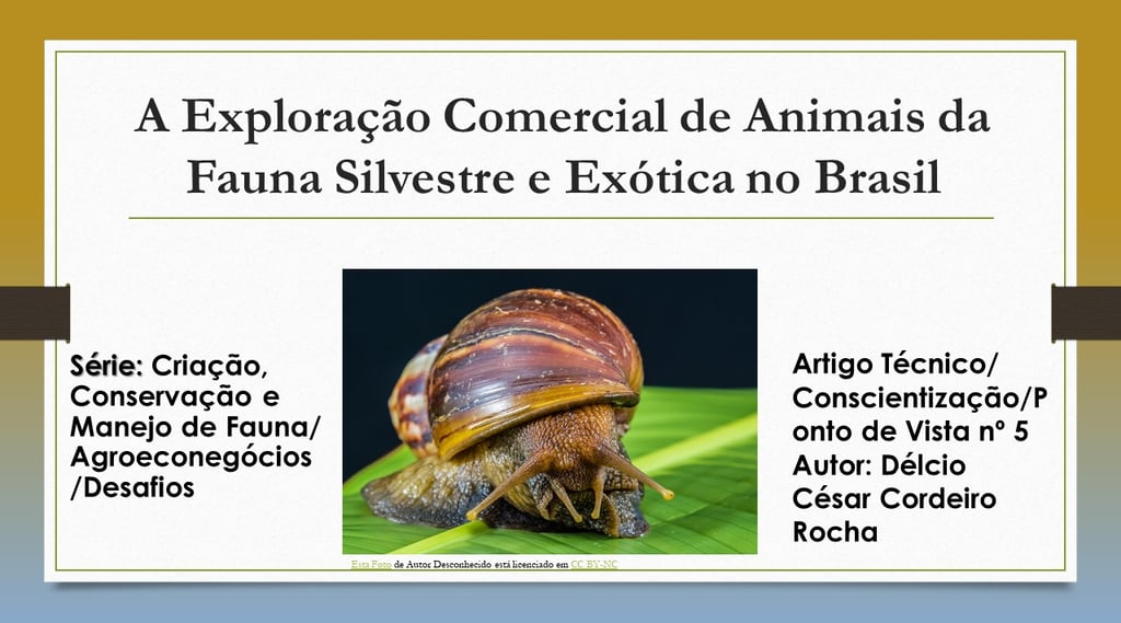 Portal AGROECOBRASIL. ROCHA, Délcio César Cordeiro. A Exploração Comercial de Animais da Fauna Silvestre e Exótica no Brasil. Disponível em: https://agroecobrasil.com/a-exploracao-comercial-de-animais-da-fauna-silvestre-e-exotica-no-brasil Série: Criação, Conservação e Manejo de Fauna/ Agroeconegócios/Desafios. Artigo técnico/Conscientização/ Ponto de Vista nº5. Publicado em 2022. Acesso: DIA/MES/ANO
