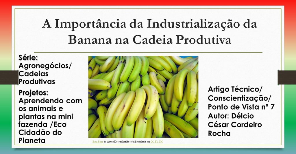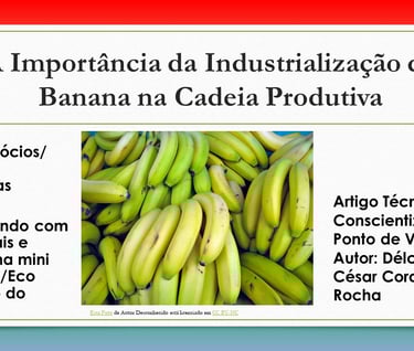 Portal AGROECOBRASIL. ROCHA, Délcio César Cordeiro. A Importância da Industrialização da Banana na Cadeia Produtiva. Série: Agronegócios/ Cadeias Produtivas. Artigo técnico/ Conscientização/ Ponto de Vista nº7. Publicado em 2024. Disponível em: https://agroecobrasil.com/a-importancia-da-industrializacao-da-banana-na-cadeia-produtiva. Acesso em DIA/ MÊS/ ANO