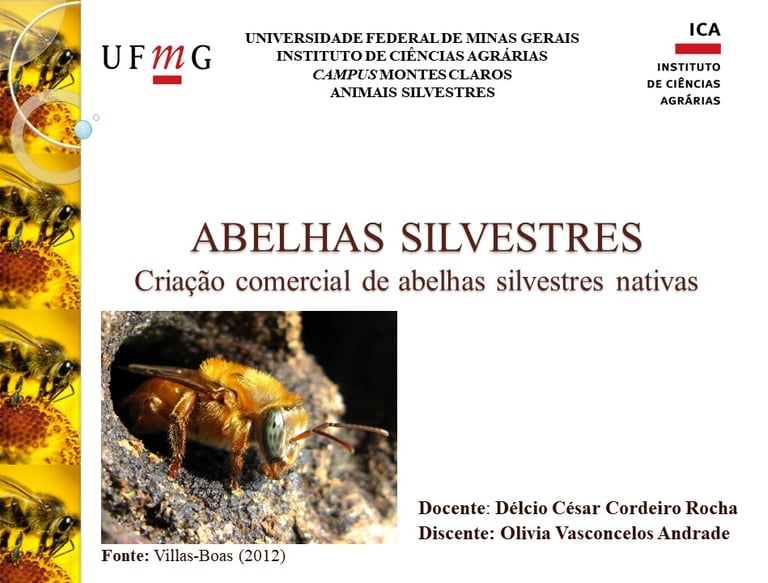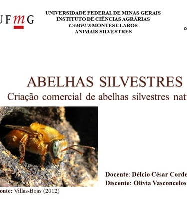 ABELHAS SILVESTRES Criação comercial de abelhas silvestres nativas - Comportamento e bem estar. realizada pela acadêmica Olivia Vasconcelos Andrade , Disciplina de Animais Silvestres ICA/UFMG Disciplina: Etologia , Prof. Délcio César Cordeiro Rocha