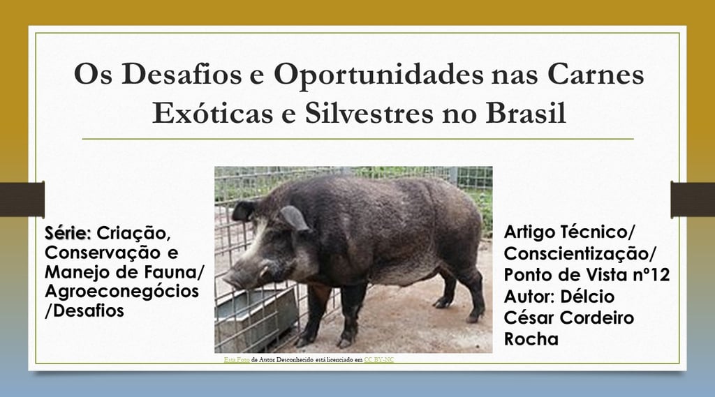 Portal AGROECOBRASIL. ROCHA, Délcio César Cordeiro. Os Desafios e Oportunidades nas Carnes Exóticas e Silvestres no Brasil . Disponível em: https://agroecobrasil.com/os-desafios-e-oportunidades-nas-carnes-exoticas-e-silvestres-no-brasil Série: Criação, Conservação e Manejo de Fauna/ Agroeconegócios/Desafios. Artigo técnico/Conscientização/ Ponto de Vista nº12. Publicado em 2022. Acesso: DIA/MES/ANO