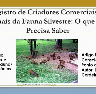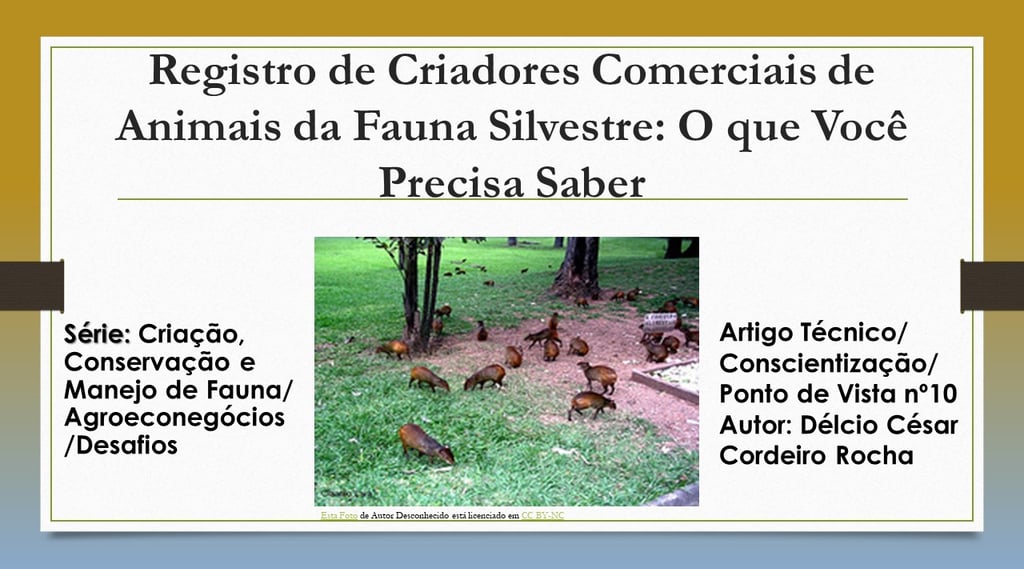 Portal AGROECOBRASIL. ROCHA, Délcio César Cordeiro. Registro de Criadores Comerciais de Animais da Fauna Silvestre: O que Você Precisa Saber. Disponível em: https://agroecobrasil.com/registro-de-criadores-comerciais-de-animais-da-fauna-silvestre-o-que-voce-precisa-saber Série: Criação, Conservação e Manejo de Fauna/ Agroeconegócios/Desafios. Artigo técnico/Conscientização/ Ponto de Vista nº10. Publicado em 2022. Acesso: DIA/MES/ANO