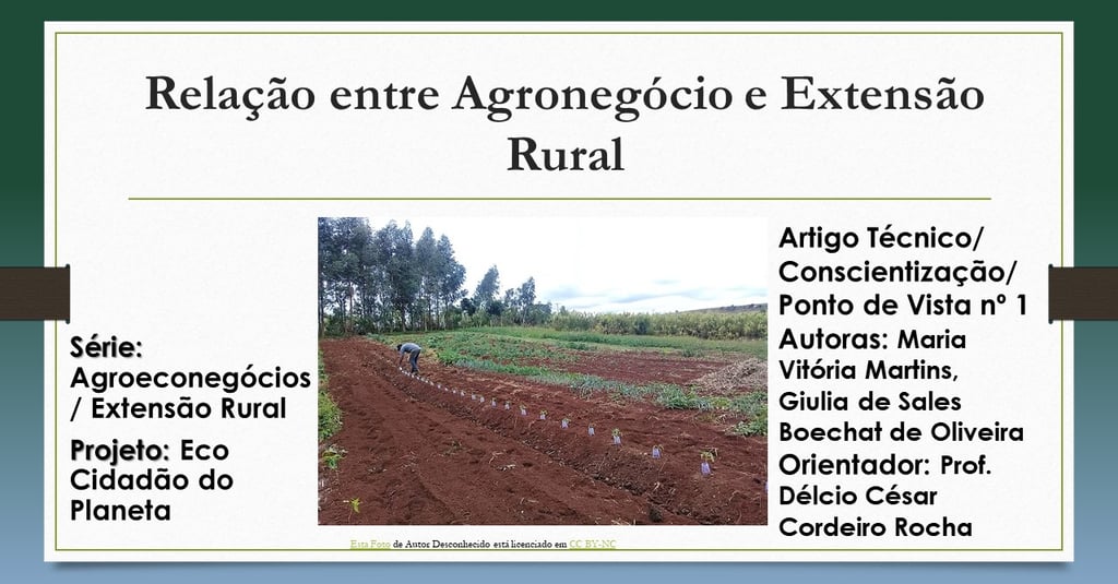Portal AGOECOBRASIL. MARTINS, M. V.; OLIVEIRA, G. de S. B. de.; & ROCHA, D. C. C. Relação entre Agronegócio e Extensão Rural. Série: Agronegócios e Extensão Rural. Artigo técnico/ Conscientização/ Ponto de Vista nº1. Publicado em 2025. Disponível em: https://agroecobrasil.com/relacao-entre-agronegocio-e-extensao-rural. Acesso em DIA/ MÊS/ ANO