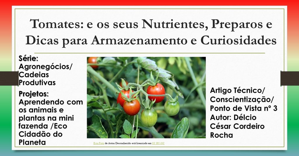 Portal AGROECOBRASIL. ROCHA, Délcio César Cordeiro. Tomates: e seus Nutrientes, Preparos e Dicas para Armazenamento e Curiosidades. Série: Agronegócios/ Cadeias Produtivas. Artigo técnico/ Conscientização/ Ponto de Vista nº3. Publicado em 2024. Disponível em: https://agroecobrasil.com/tomates-e-seus-nutrientes-preparos-e-dicas-para-armazenamento-e-curiosidades. Acesso em DIA/ MÊS/ ANO